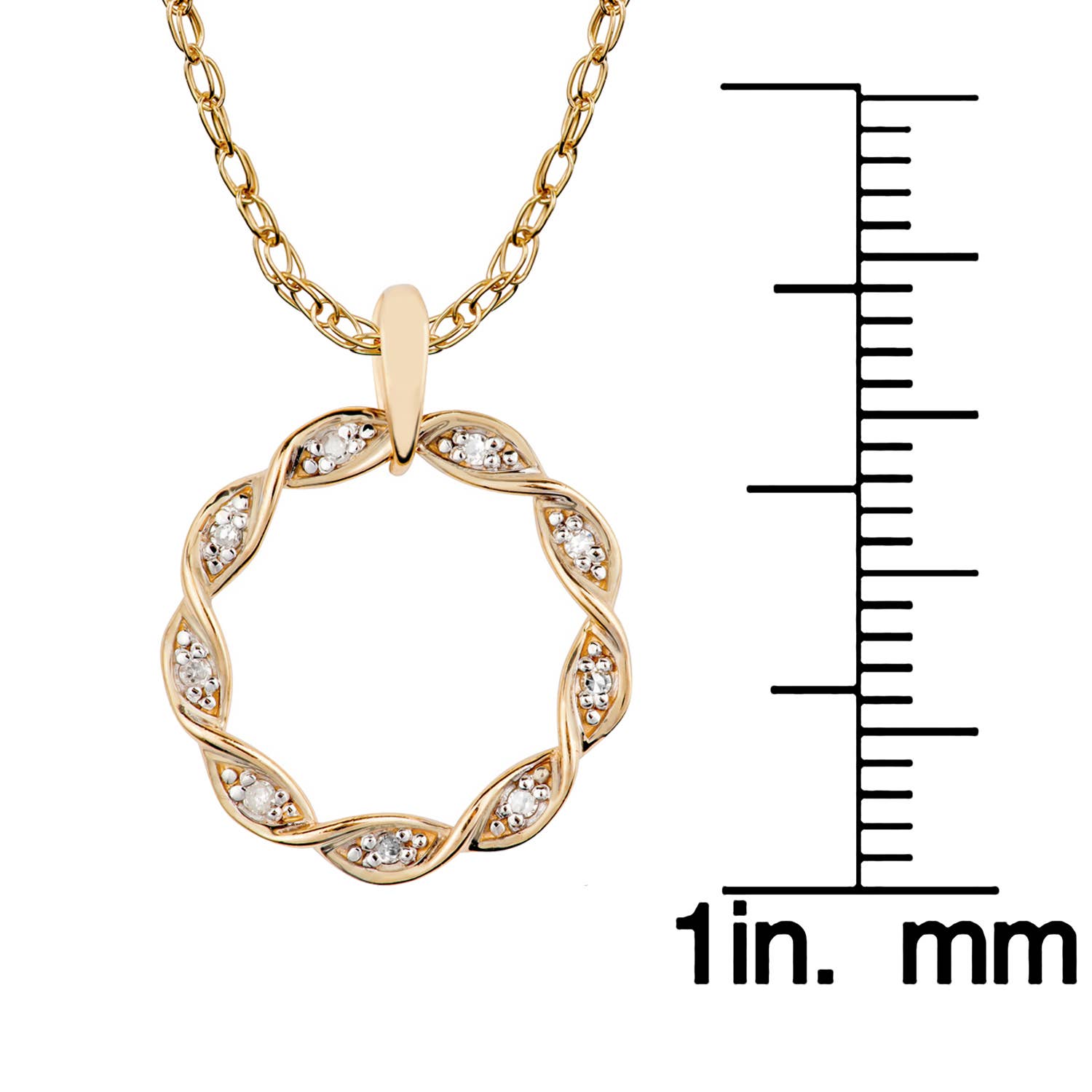 Enhance your jewelry collection with this elegantly designed diamond pendant necklace, crafted in 10K yellow gold. The pendant features a braided circle design, symbolizing unity and eternity, with nine brilliant round-cut diamondsset in secure prong settings. The diamonds offer a total weight of 0.06 carats, with a sparkling H-I color and I1-I2 clarity.