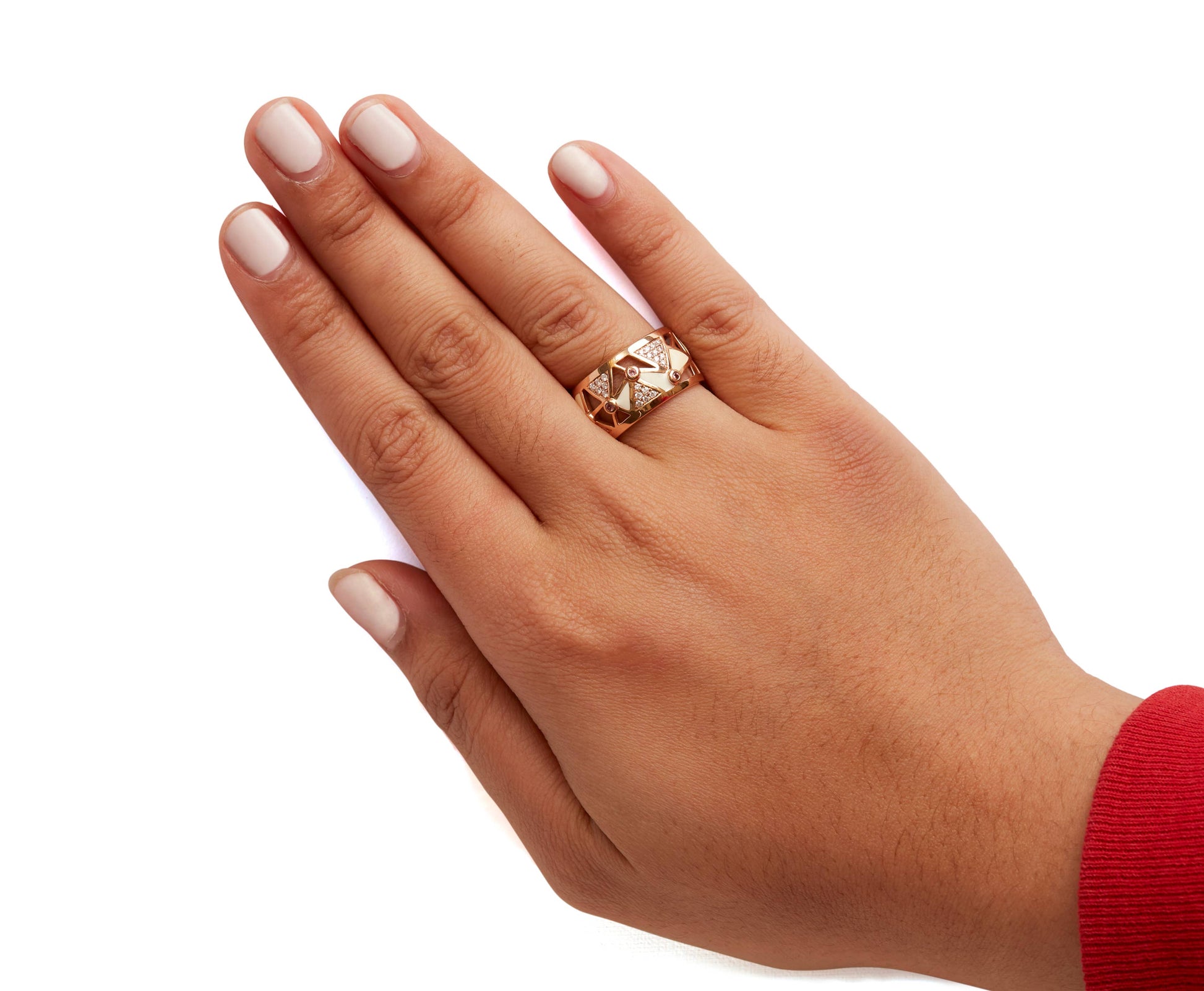 At the heart of this masterpiece, five lab-created pink tourmalines (5x5mm each) shimmer in radiant hues, enhanced by geometric white enamel cutouts for a bold yet refined contrast. Designed to be both striking and wearable, this ring is perfect for those who appreciate exceptional craftsmanship and statement-making elegance.
